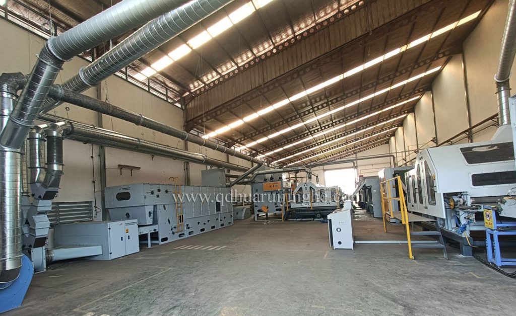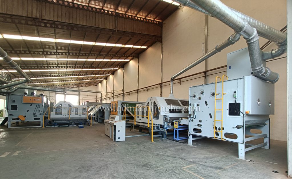 開包機——預開松——精開松——給棉機——梳理機——鋪網(wǎng)機——烘箱——燙光機——成卷機。
